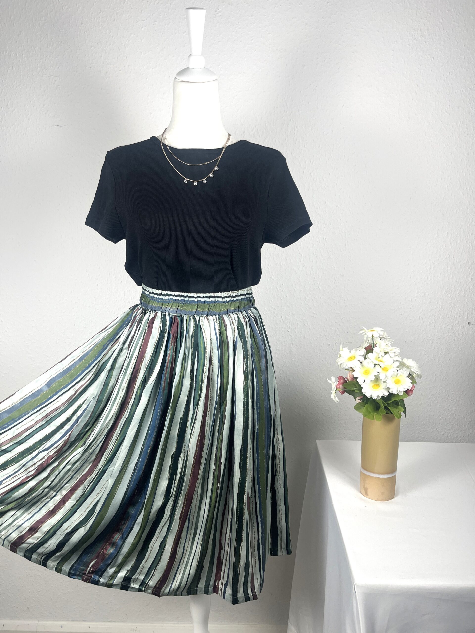 Crafted from Modal Satin, the skirt offers a beautiful silky sheen and an incredibly soft, fluid drape. This lightweight fabric moves beautifully without a lining, enhancing its airy feel. The print features a bold mix of vertical stripes in rich, earthy and jewel tones like maroon, hunter green, deep blue, and light aqua, creating a stylish, artistic effect. It has a comfortable elasticated waistband that gathers at the top, ensuring an easy pull-on fit and a flattering silhouette.