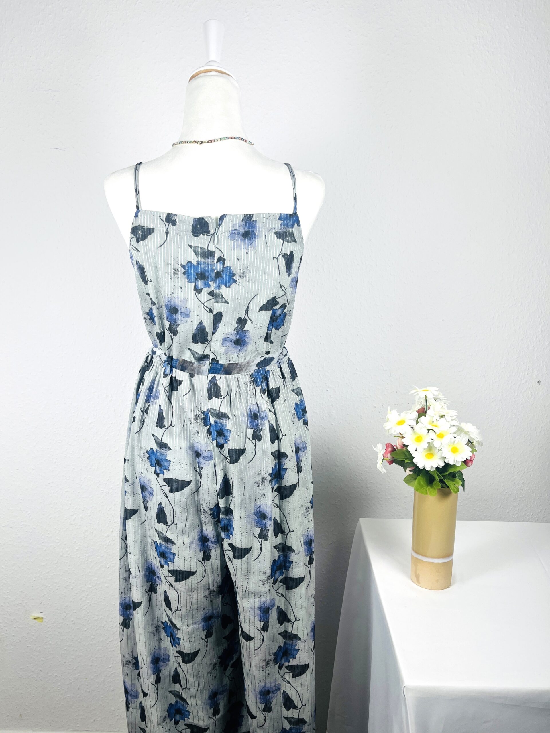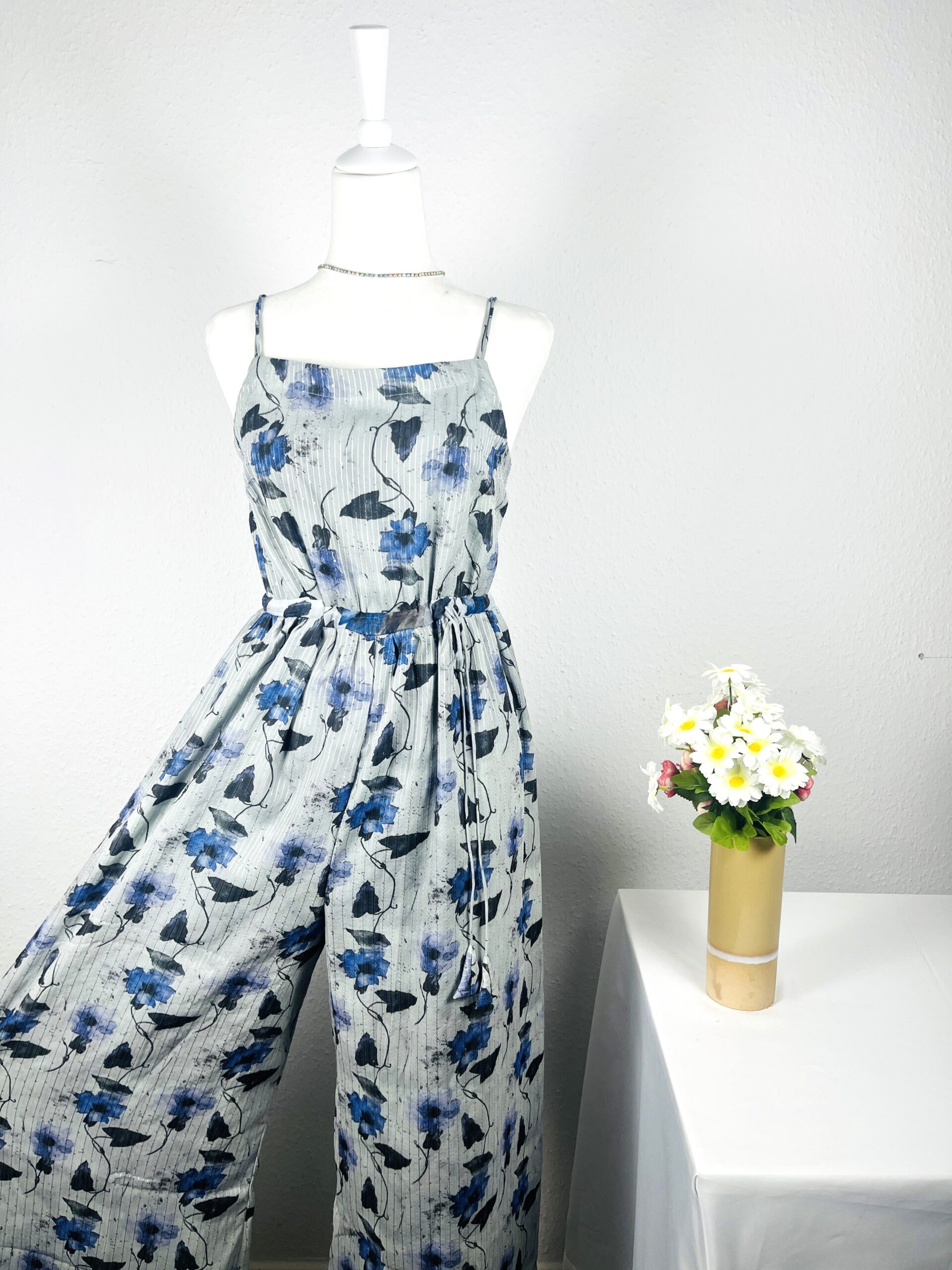 Crafted from lightweight Georgette fabric, the material ensures an airy feel and a beautiful, soft drape that flows elegantly into wide legs. The print features artistic blue and purple florals overlaying a subtle striped grey background, creating a unique, refined look. It has a contemporary square neckline with delicate spaghetti straps and a long, comfortable trouser silhouette. Fully lined for comfort and a smooth fit, the jumpsuit includes a back zip closure and an adjustable hip strap (tie), allowing you to cinch the waist for a customized and flattering silhouette.