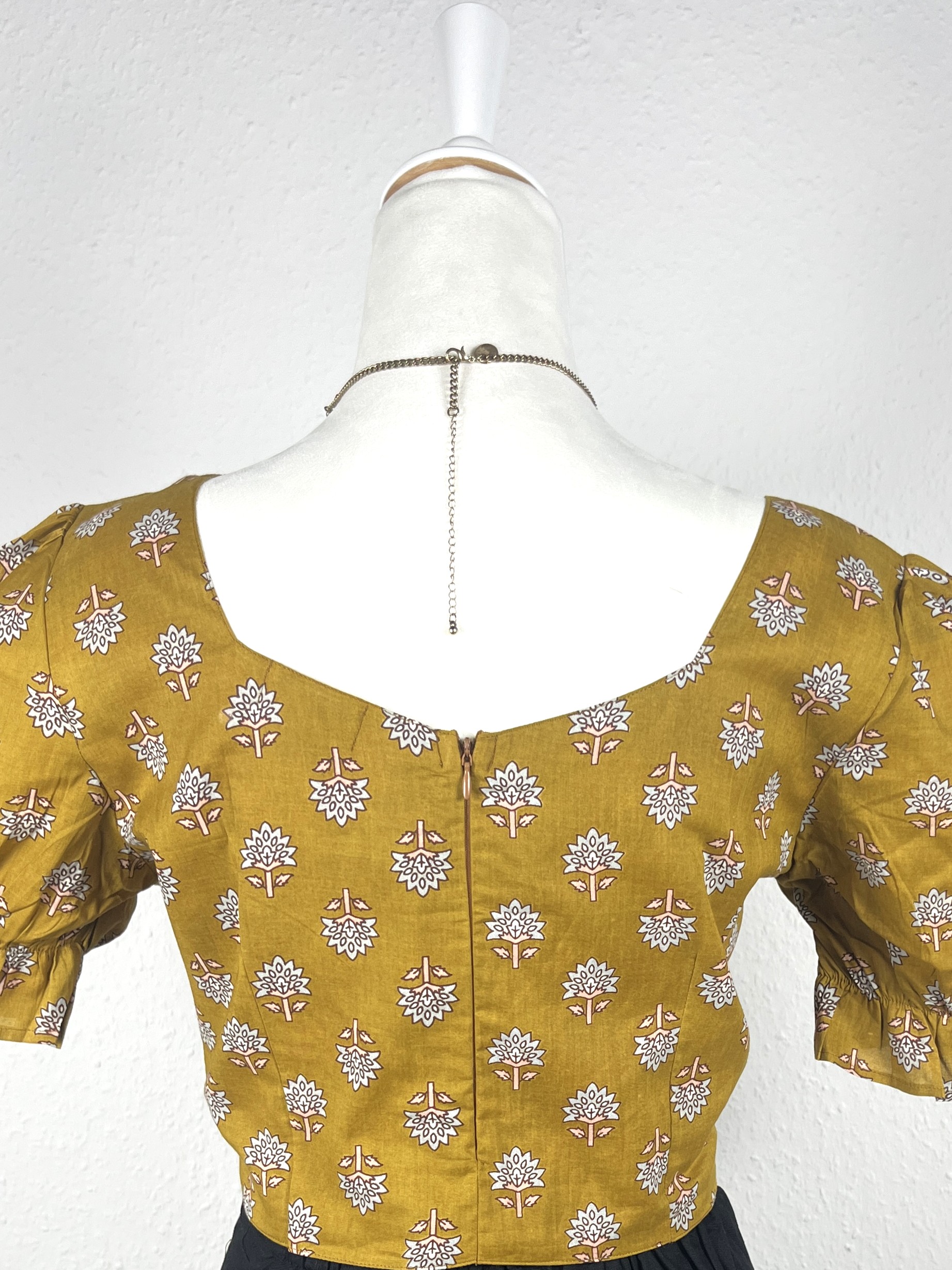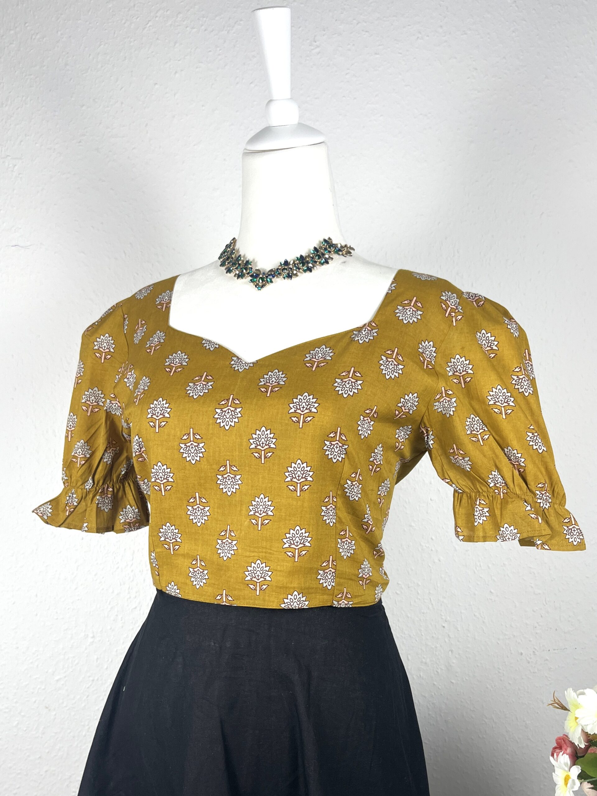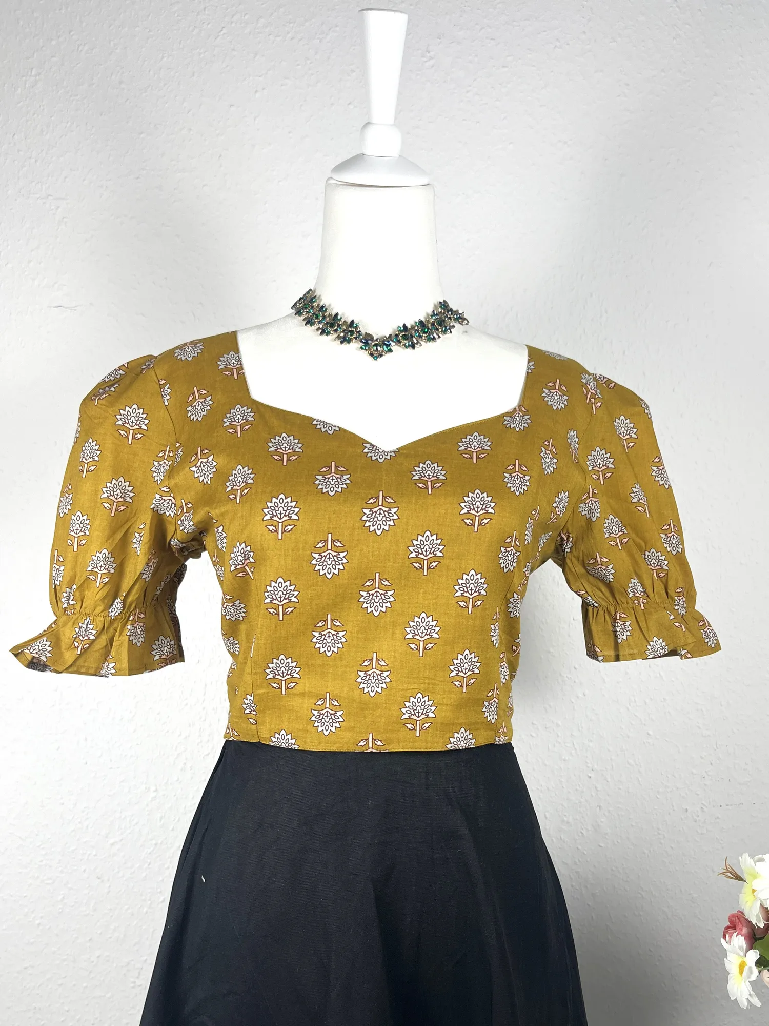Crafted from 100% pure cotton, the fabric ensures breathability and a comfortable, soft feel. The top showcases a vibrant mustard yellow base adorned with an elegant off-white and maroon botanical block print. It features a flattering sweetheart neckline and charming puffed sleeves that finish with a gentle ruffle at the elbow. The bodice is likely lined for a smooth fit, and the convenient back zip closure ensures a sleek, tailored finish.