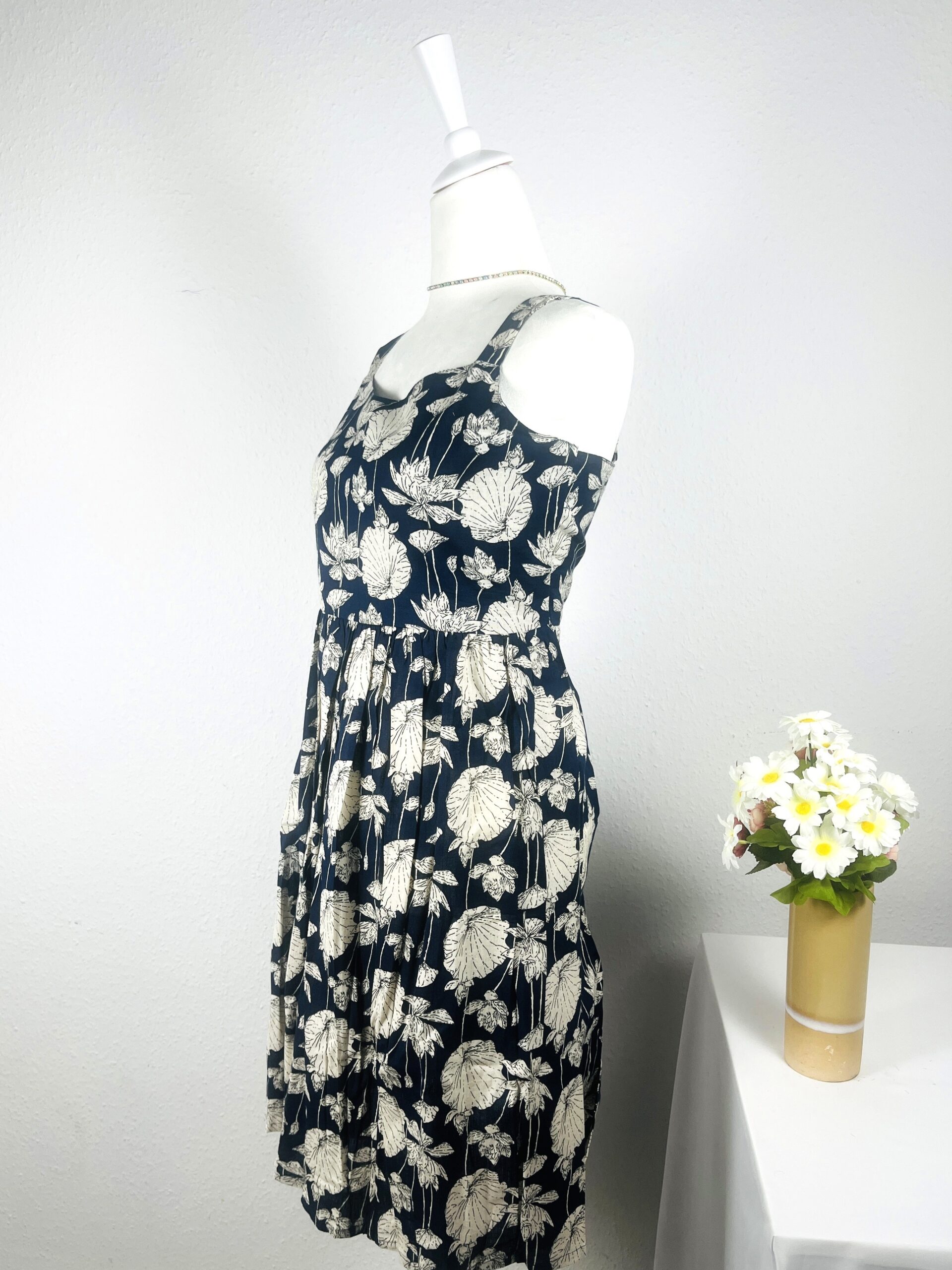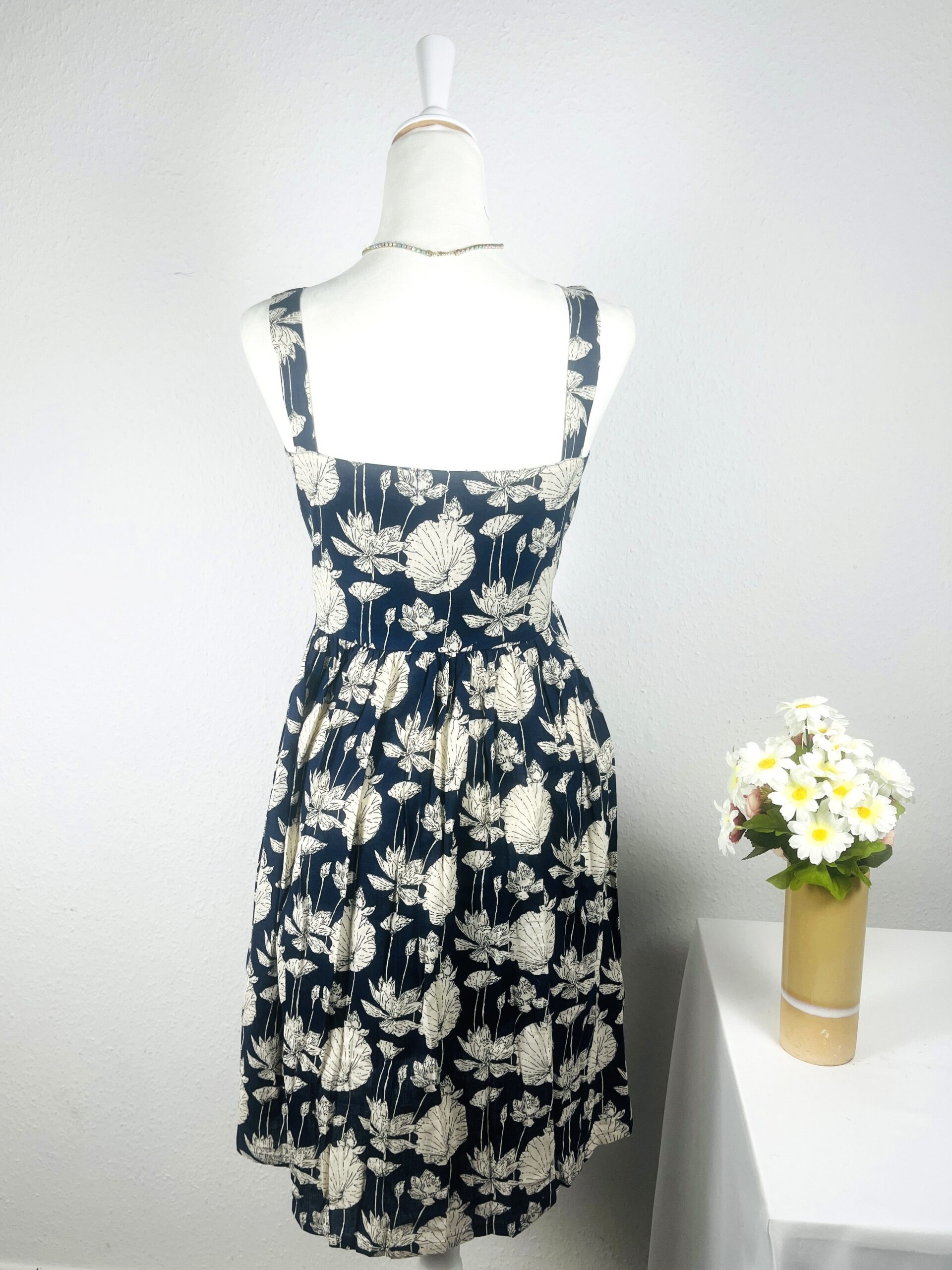 Crafted from 100% pure cotton, the fabric ensures ultimate breathability and softness. The rich navy blue base provides a beautiful contrast to the intricate off-white/beige botanical and shell-like print, creating a subtle yet captivating look. It features a fitted bodice with a sweetheart neckline and comfortable wide straps, flowing into a softly gathered skirt. The dress is partially lined in the body for a smooth fit and added structure where you need it most.
