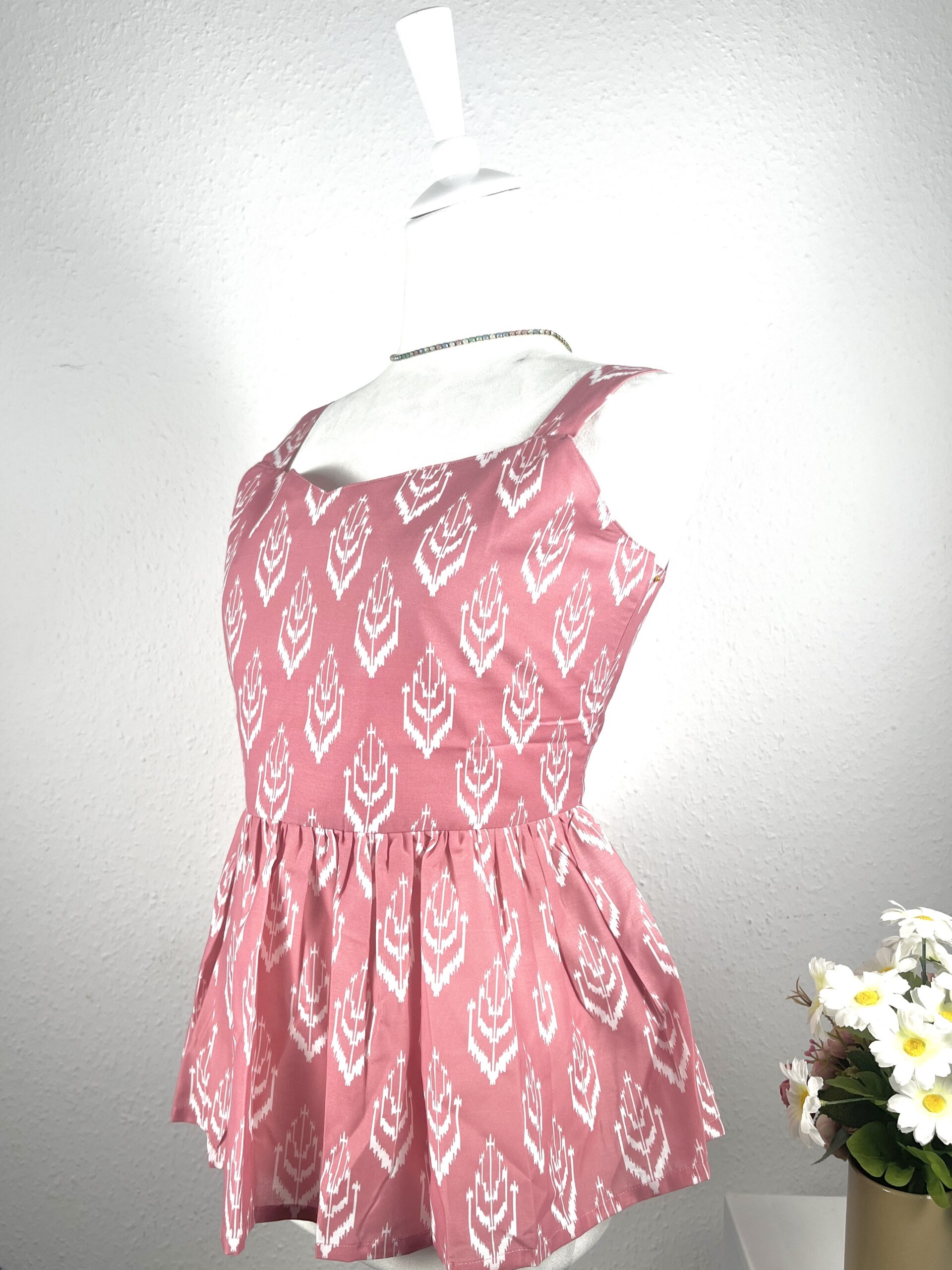 Rose Pink base with an all-over white Ikat-inspired print.