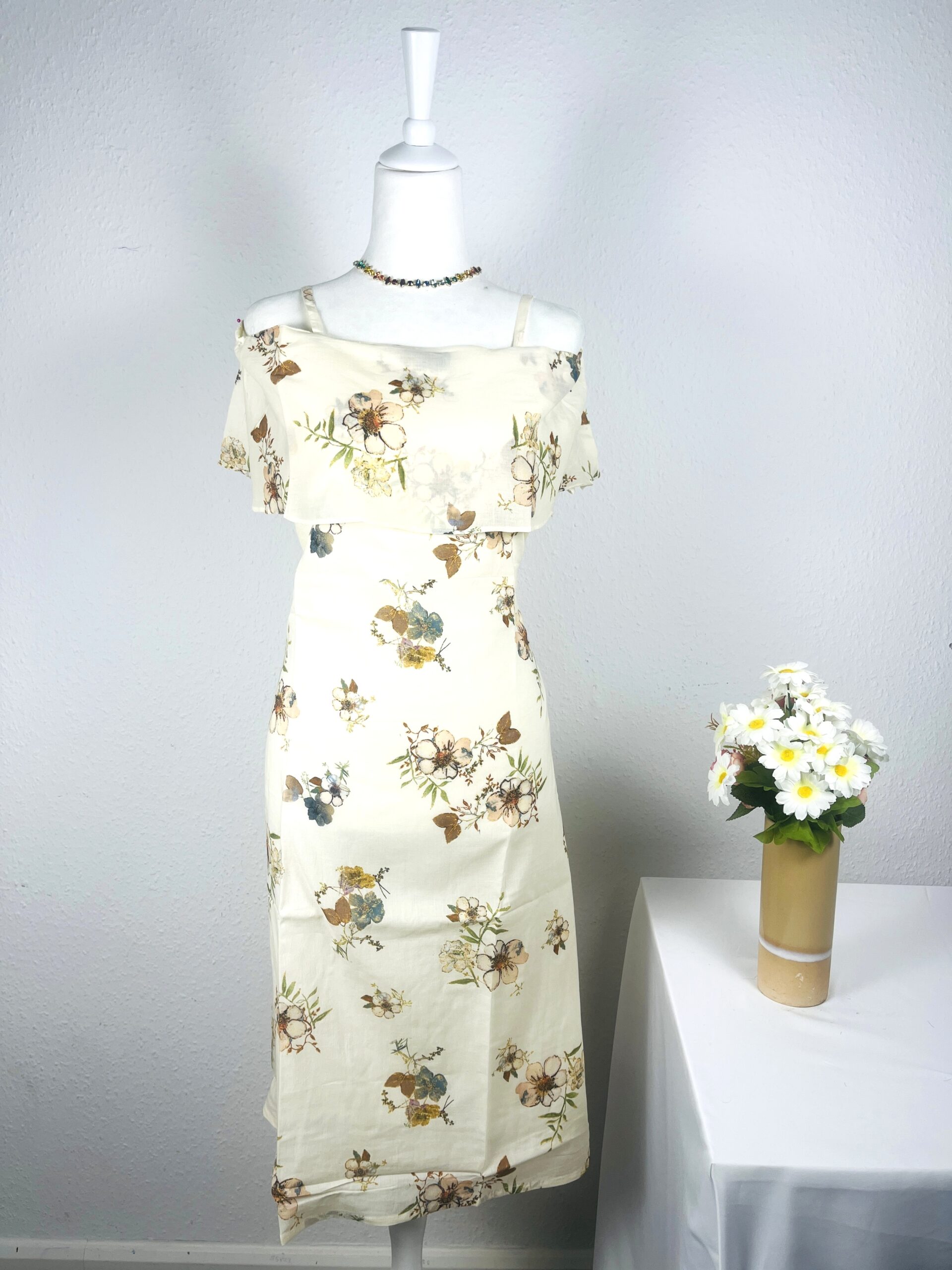 Crafted from premium Malmal cotton, known for its incredibly soft, lightweight, and breathable texture, it drapes beautifully and feels gentle against your skin. The vibrant, multicoloured floral print pops against the sophisticated black background, while the off-shoulder ruffle detail and delicate spaghetti straps add a romantic, trendy touch. It is fully lined for a smooth fit and enhanced comfort, this dress is a must-have for garden parties, brunches, or evening outings.